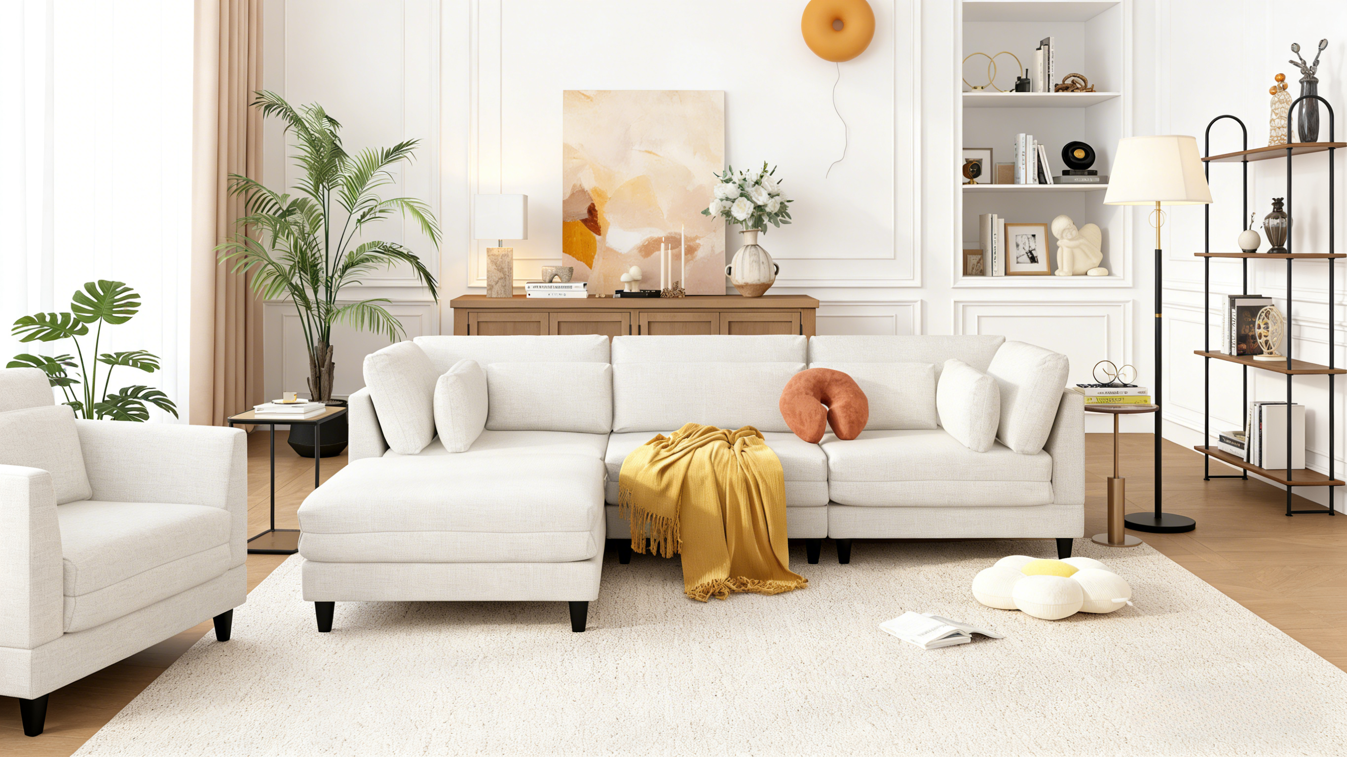 Accompanied by four plush pillows, this modern classic four-seater offers ample space for lounging alone or gathering with loved ones, all wrapped in a clean, versatile silhouette.