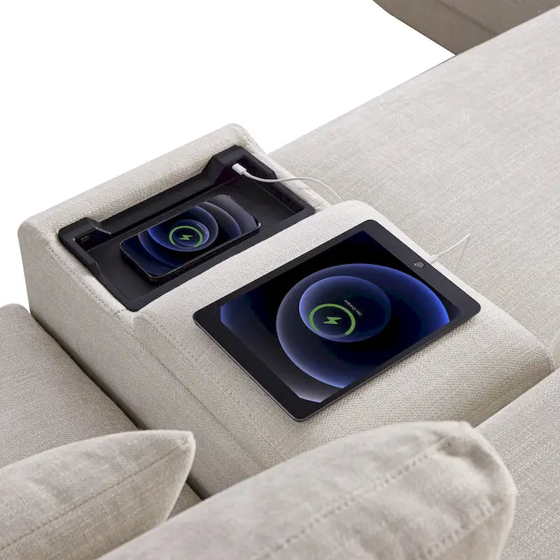 Experience the ultimate in comfort and convenience with our Extra-Wide Modular Sectional Sofa, designed to elevate your living space. Featuring a 33 extra-wide seat and 12 ultra-thick cushions, this sofa provides exceptional support and cushioning for hours of relaxation. The innovative console includes a flip-top and drawer for easy storage, while the multifunctional storage tray offers both wired and wireless charging to keep your devices powered. With its modular design, reversible console, and movable ottoman, this sofa offers unparalleled flexibility and style, making it the perfect addition to any living room.