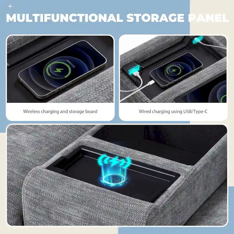 - Storage Tray with Wired & Wireless Charging: Offers a flat surface to hold items and incorporates both wired and wireless charging capabilities, ensuring your devices stay charged while you relax.