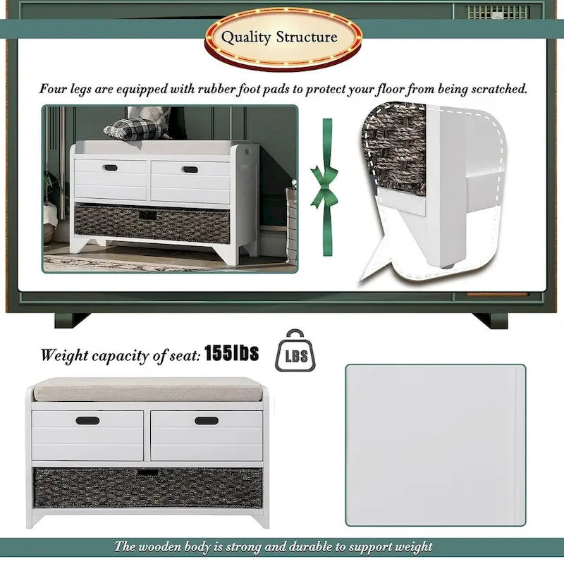 Introducing our Rustic Storage Bench with a versatile design to complement any space in your home. Crafted with a premium acacia wood frame and MDF boards, this bench boasts a strong and durable structure for long-lasting use. The fully assembled piece features a thick cushioned upper, 2 drawers, and a removable basket, providing spacious storage for shoes, hallway clutter, or clothes in the living room or bedroom. The hollow handles on both sides ensure convenient mobility, while the NC painting finish adds a touch of elegance. Enjoy instant enjoyment with no assembly required.