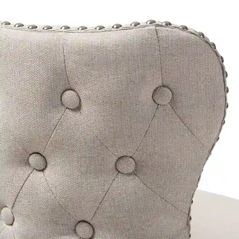 Elevate your home bar with the Gradisca 2-Piece Swivel Bar Stool Set by Baxton Studio. These modern bar stools feature a sturdy rubberwood and MDF frame with a walnut finish and integrated footrests. The hour-glass shaped backrest and swivel seat are upholstered in polyester fabric, accented with nailhead trim and button tufting for added charm. With a fully upholstered back and seat, tapered legs with stretcher support, and available in grey or light beige, these bar stools will add a touch of sophistication to any home bar.