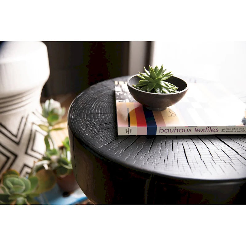 Crafted with cast resin in a design to portray natures aged roots, the carved stump side table is hand-painted with a bold geometric tribal print on a dark monochromatic background.