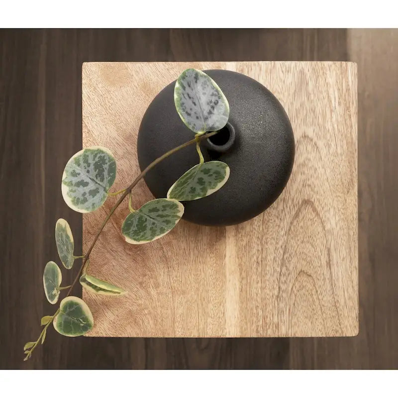 Rethink your transitional home decor with this space-saving square drink table from Kate and Laurel. The Karlsen accent table provides your space with a high-quality construction that is built to last. Its unique mixed materials design combines elements of both contemporary and timeless decor styles. The Karlsen features a sizable tabletop that is 2.5 inches thick, giving you a substantial platform to hold your decorative elements. Crafted as a welcomed accent for any living room, the Karlsen is perfect as a small plant stand next to your comfy sofa or chair. Its height makes it a lovely vessel for holding a plant, media remotes, or a drink on a coaster. Its small shape makes it ideal for sliding between chairs, or displaying against a wall in an apartment or small living space. The Karlsen's base is constructed from 100% iron, ensuring that you're getting a resilient, substantial piece that will charm your guests for years to come. This particular design features a natural mango wood tabletop handcrafted by artisans in India that pairs nicely with its sturdy rectangular base. The overall dimensions of the Karlsen side table are 8 inches wide by 23 inches high by 8 inches deep.