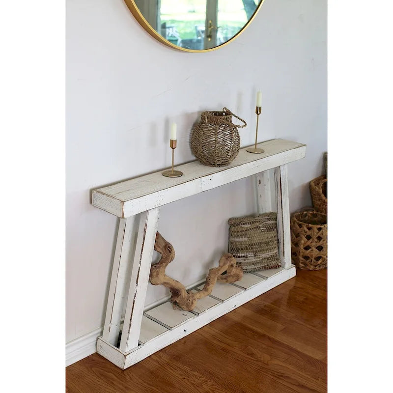 Truly unique console table has been built from naturally weathered reclaimed wood and is perfect to showcase at any entry way or any area that needs some life. Table measures 46L x 7W x 28H and has been painted white and moderately distressed. This piece truly captures the natural and genuine rustic heart and will add the perfect rustic charm to your space.