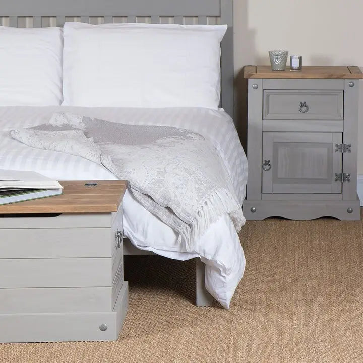 Add a touch of rustic elegance to your bedroom with the Wood Nightstand from the Corona Collection. Made of solid pine wood from renewable resources, this nightstand features real dovetail drawer joints and wooden runners for durability, along with distressed silver metal handles, hinges, and studs for a vintage look. The gray wash color stain with antique brown tops adds a touch of sophistication to any room. With easy-to-follow instructions and fittings, assembly is a breeze.